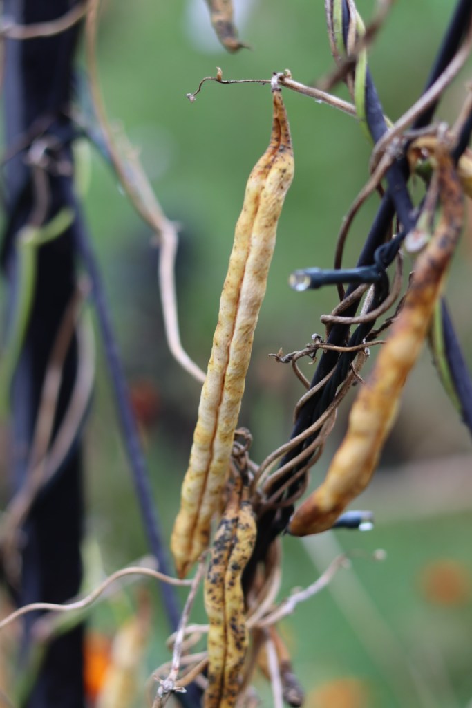 Beans are so easy to save seeds from. The only thing you have to do is let some of the pods dry out on the plant. When the pods are fully dried out simply open them up, remove the beans and put them in a packet for next year. If they are a little damp (as things can be this time of year!) I recommend leaving them to dry spread out on some kitchen roll or something for a few days so you don’t risk them going mouldy over winter.